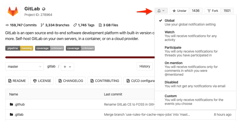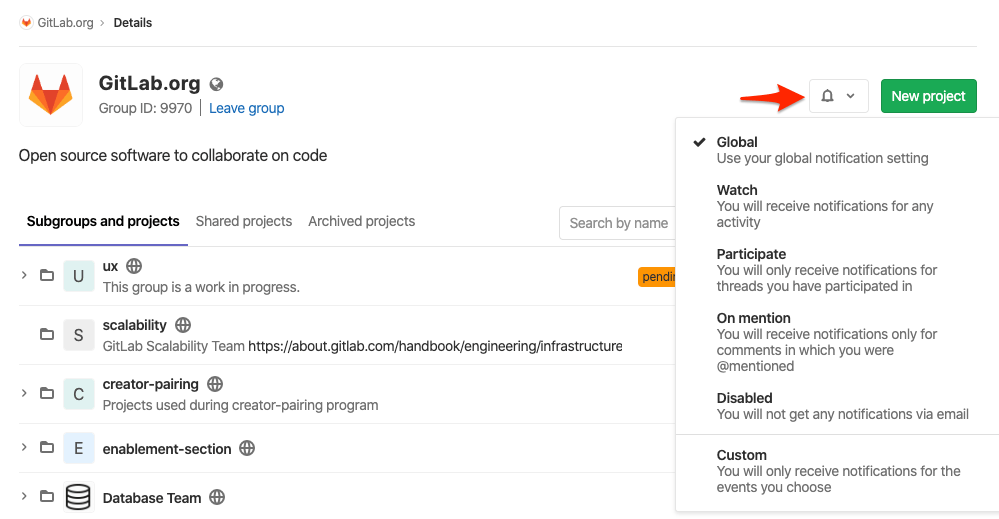 - For each project, you can select a notification level. Your project setting overrides the group setting.